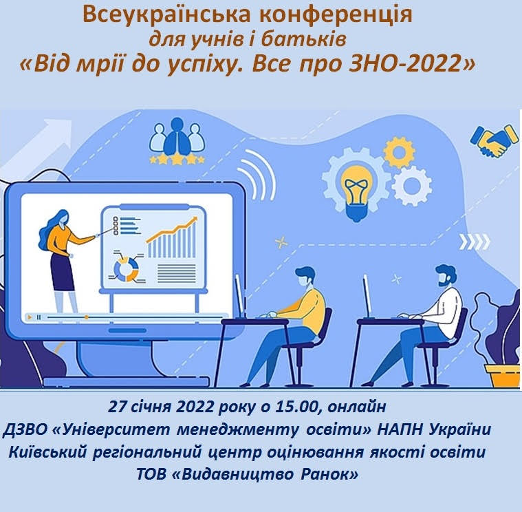 27 січня 2022 року о 15.00 у форматі онлайн відбудеться Всеукраїнська конференція для учнів і батьків «Від мрії до успіху. Все про ЗНО-2022». Участь безкоштовна.