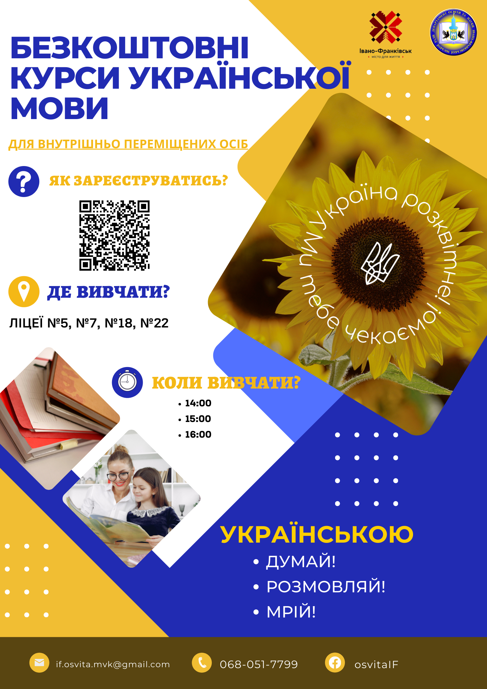 Департаментом освіти та науки Івано-Франківської міської ради розпочато реєстрацію на безкоштовні курси української мови для внутрішньо переміщених осіб, що діятимуть на базі ліцеїв №5, 7, 18, 22.