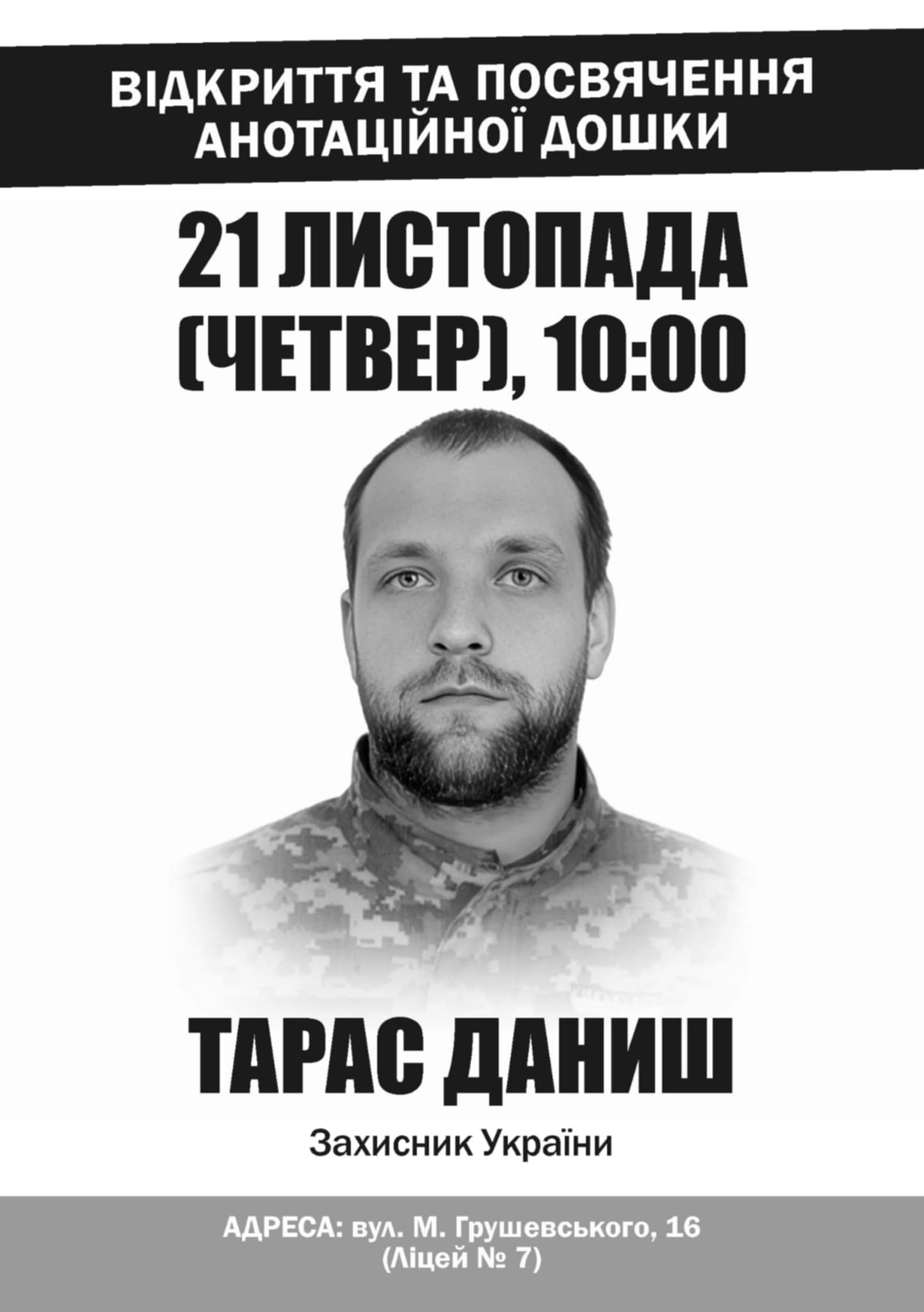 Завтра, 21 листопада, відбудеться відкриття анотаційної дошки полеглому захиснику Тарасу Данишу.
