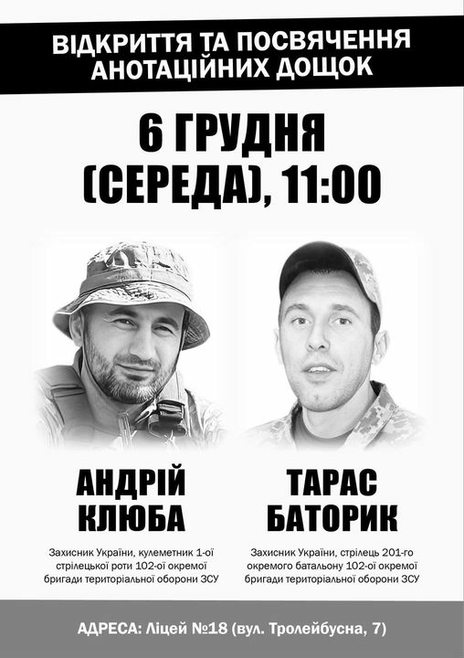 6 грудня об 11:00 відбудеться відкриття анотаційних дощок на фасаді Ліцею №18