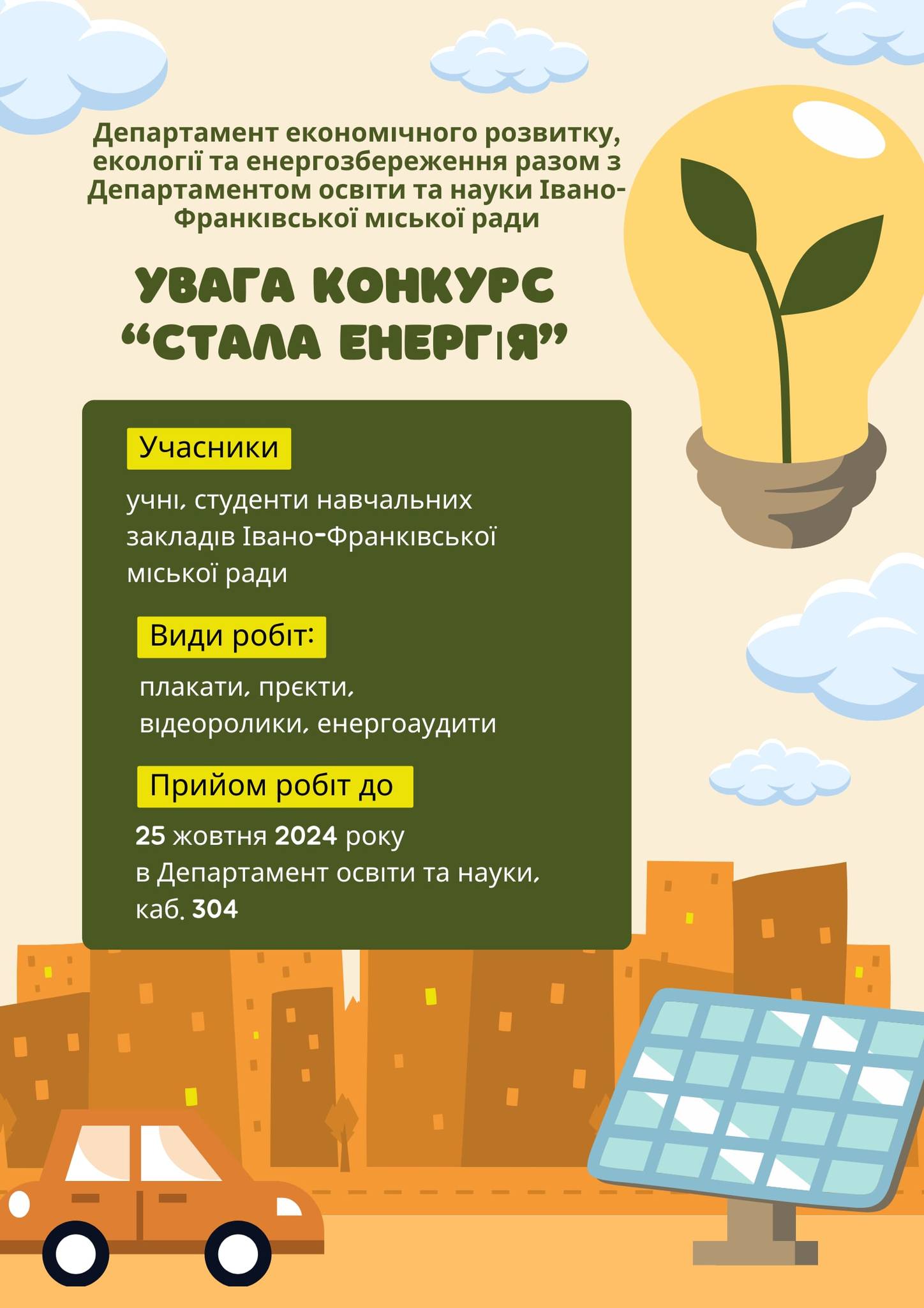 Департамент освіти та науки Івано-Франківської міської ради рамках проведення Днів сталої енергії організовують конкурс «СТАЛА ЕНЕРГІЯ». До участі в конкурсі запрошуються учні та студенти навчальних закладів Івано-Франківської міської ради.