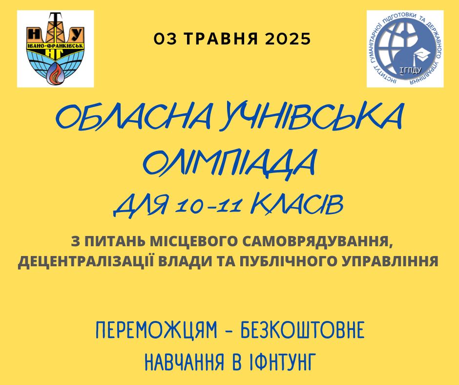 3 травня о 10:00 на базі Інституту гуманітарної підготовки та державного управління ІФНТУНГ (м Івано-Франківськ, вул. Короля Данила, 13) буде проведено 7-му Обласну учнівську олімпіаду з питань місцевого самоврядування, децентралізації влади та публічного управління.