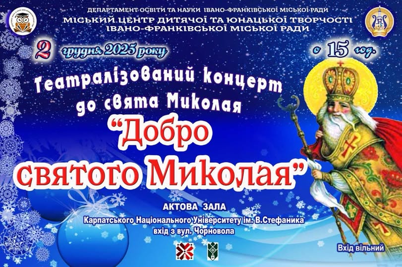 Вже 2 грудня о 15:00 відбудеться театралізований концерт «Добро святого Миколая». На вас чекають щирі емоції, казкові моменти та тепла атмосфера свята.