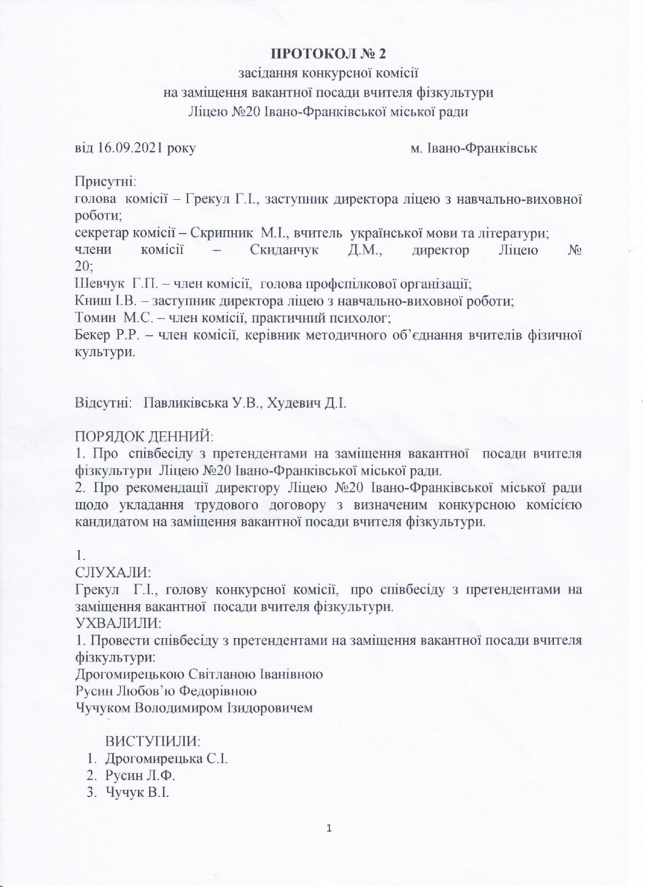 Протоколи конкурсів на посади педагогічних працівників
